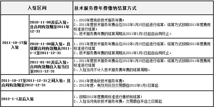 1)各一级类目技术服务费年费金额及返还比例对应的交易额详见《淘宝商城各类目费率年费保证金一览表》,资费一览表中的技术服务费年费金额及各档返还比例对应的销售额,计算区间均为2012年一整年;经营不满2012年一整年的,按店铺有效月份进行折算。
