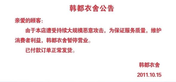 10月15日,淘宝商城恶意攻击事件继续进行,韩都衣舍淘宝商城旗舰店周六下午16时左右首页挂出停业公告“由于本店遭受持续恶意大规模攻击,为保证服务质量,维护消费者利益,韩都衣舍暂停营业。已付款订单正常发货。”韩都衣舍随后在17时左右恢复营业。