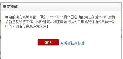 淘宝商城对商城用户发出提醒,原定于2011年10月17日启动的淘宝商城2012年度协议新签及续签工作,因故延期。淘宝商城将以公告形式另行通知具体开始时间。