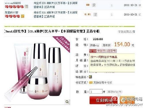 “收藏了4000多的东西,只有一家是真的平时的五折。”网友“大小姐小媳妇”一早就在微博上抱怨此次活动的折扣远没有宣传的那么大。而另一位网名为“韩潮先锋”的网友更是在微博上晒出一款某品牌的护肤品,标注其活动价格为154元,而销售记录却显示其在10月的售价仅为88元。